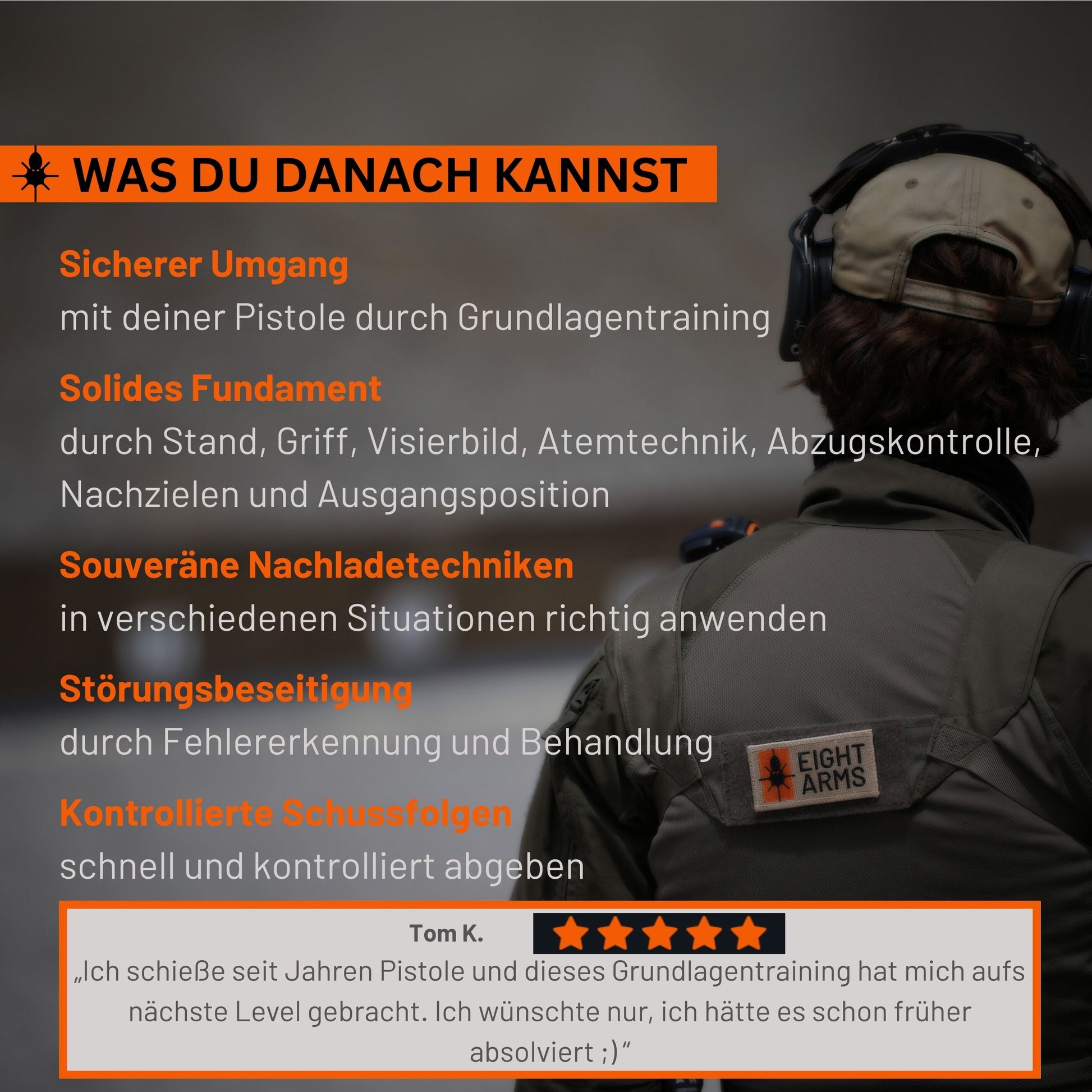 - Grundlagen der Schießtechnik (z.B. Stand, Griff, Zielen, Visierbild, Atemtechnik, Abzugskontrolle, Nachzielen, Ausgangsposition)
