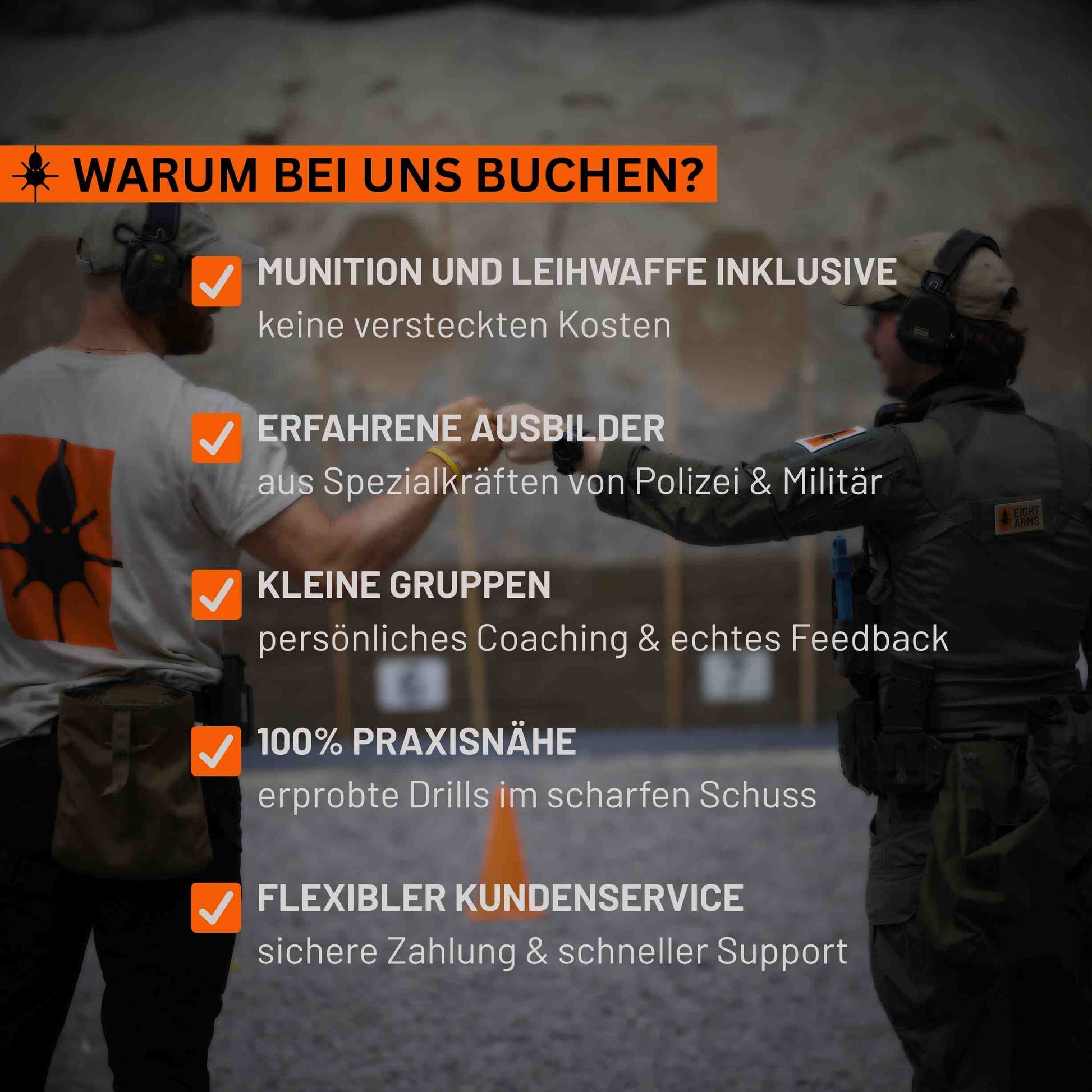 - Am Kurstag wirst du von unserem Partner auf der Shooting Range in Empfang genommen und durch den Kurs begleitet.