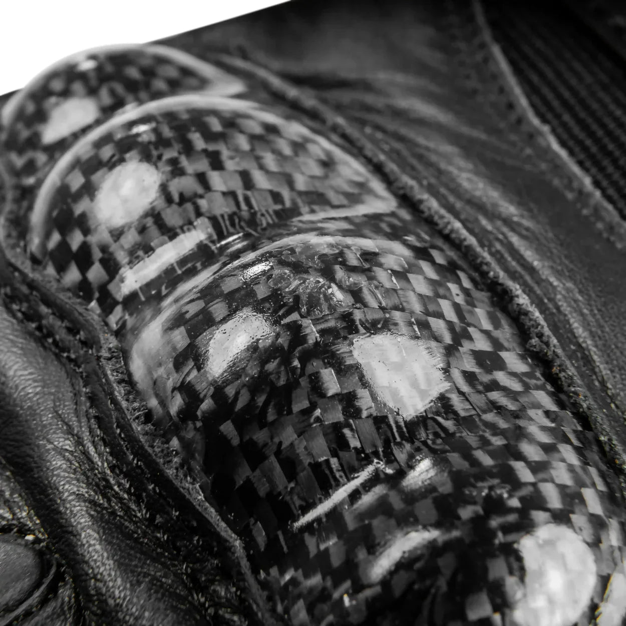 Das Herzstück des Handschuhs ist der voll-Carbon Protektor auf dem Handrücken, der die Handknöchel effektiv schützt. Die Handinnenseiten aus hochabriebfestem Industrie-Alcantara bieten dreimal mehr Abriebfestigkeit als Leder. Vorgeformte Finger und ein Klettverschluss am Handgelenk sorgen für eine perfekte Passform und sicheren Halt. Mesh-Einsätze und Gummiöffnungen an den Fingeroberseiten gewährleisten eine gute Belüftung.