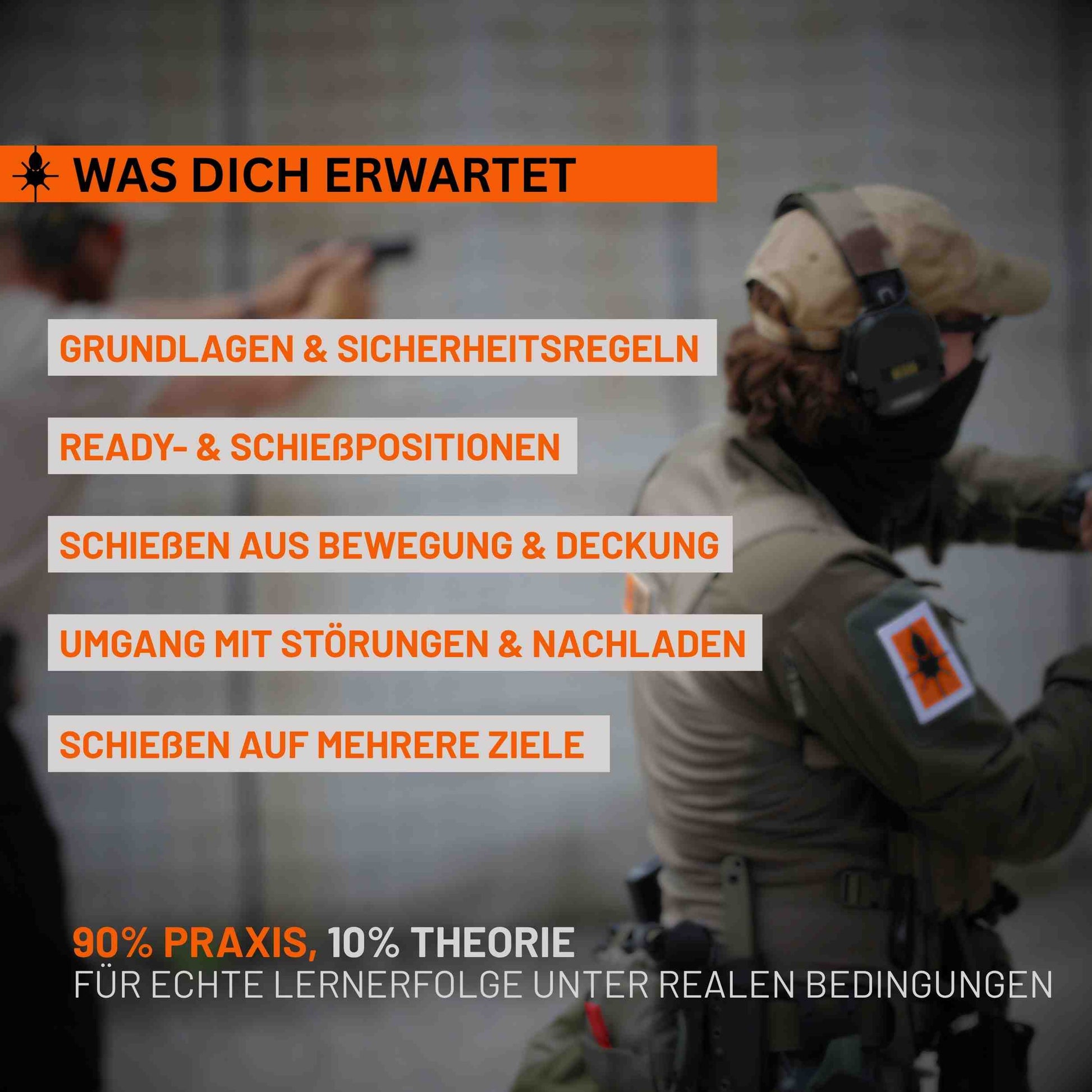 - Am Kurstag wirst du von unserem Partner auf der Shooting Range in Empfang genommen und durch den Kurs begleitet.